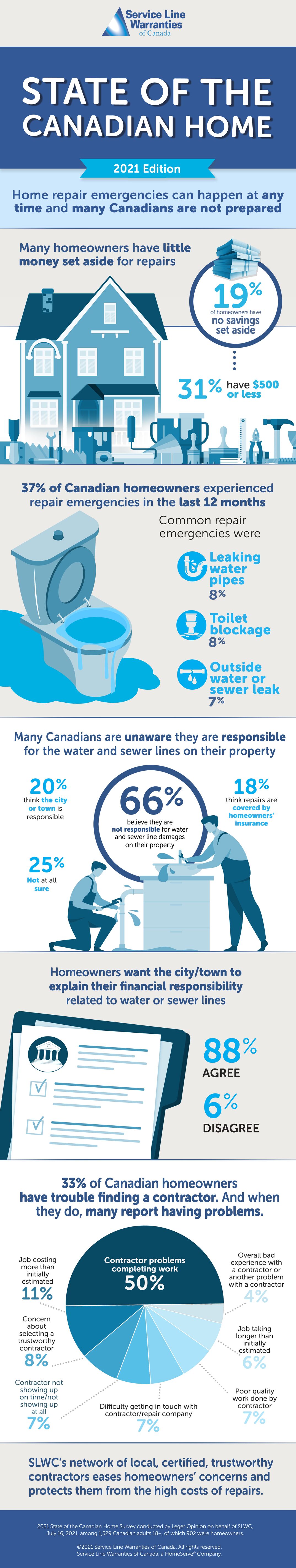 "Over the past year and a half, Canadians have spent more time at home than ever, which can take a major toll on our home's infrastructure and major systems," said Mike Van Horne, General Manager, Service Line Warranties of Canada. "The survey finding that about one-third of Canadian homeowners can expect to have a home repair emergency in a given year, coupled with far too many homeowners having limited savings for a home emergency – or no saving at all – is a real recipe for disaster."